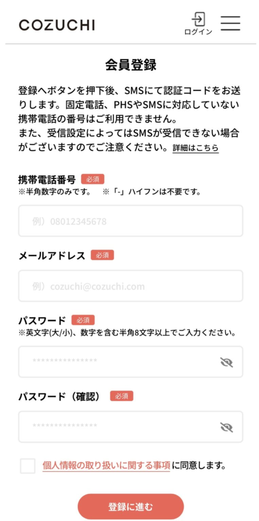 携帯電話番号、メールアドレス、パスワードを入力して「登録に進む」をタップします。