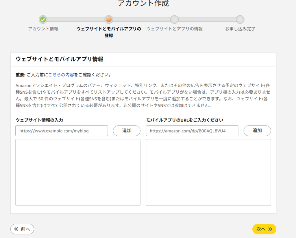 Amazonアソシエイトを利用するブログURLをコピペして、「追加」→「次へ」をクリックします。