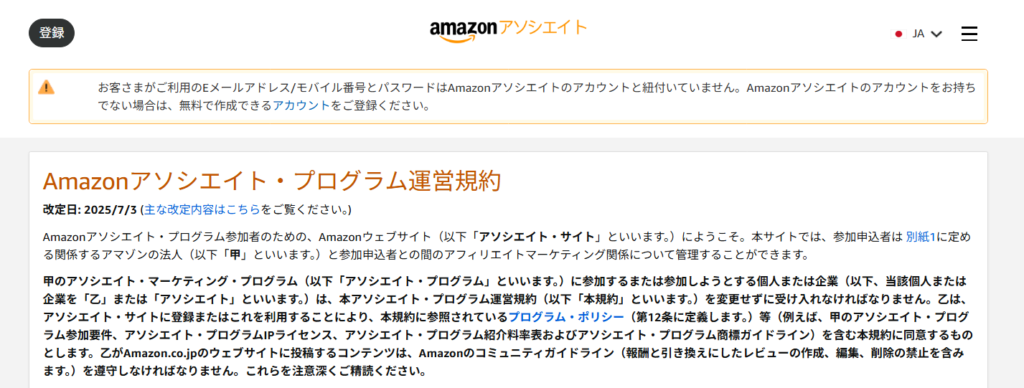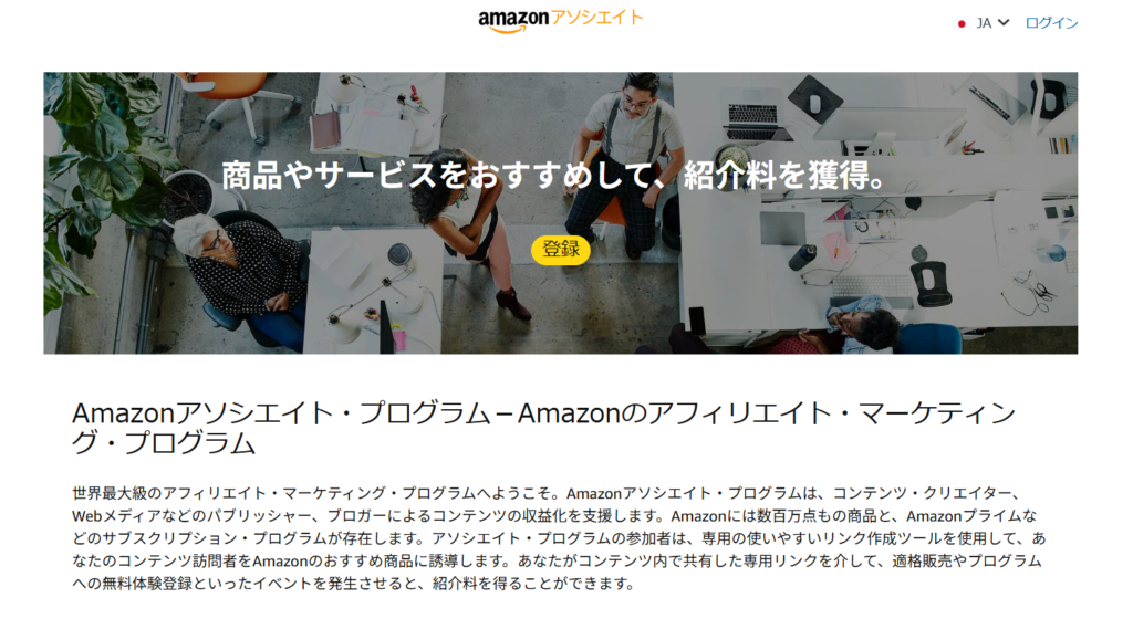 Amazonアソシエイトに登録するために、下記リンクにある「登録」をクリックします。